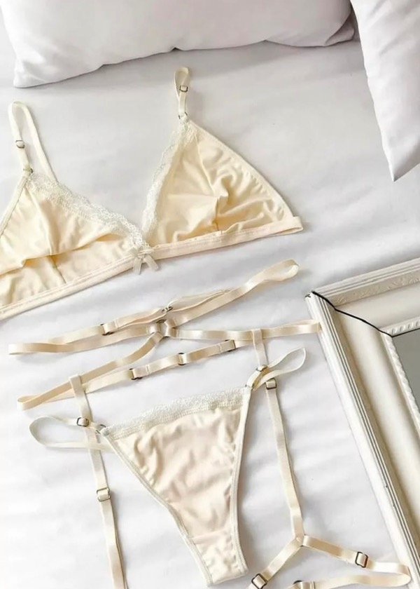 Conjunto de microfibra sin armado con detalles de puntilla, el corpiño viene por talle del 85 al 100 y la less es regulable y talle único. [no incluye arnes]