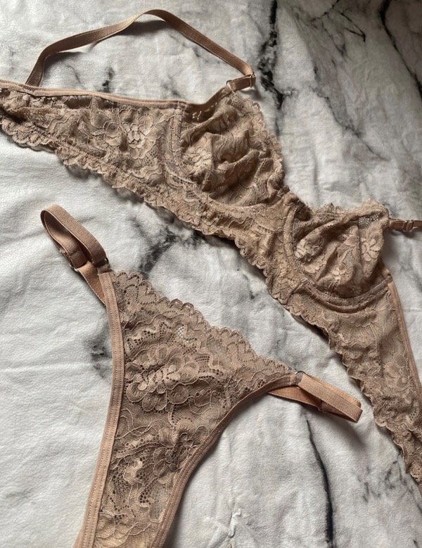Conjunto de encaje sin armado, el corpiño viene con aro y por talle del 85 al 105, la less es regulable y talle único.