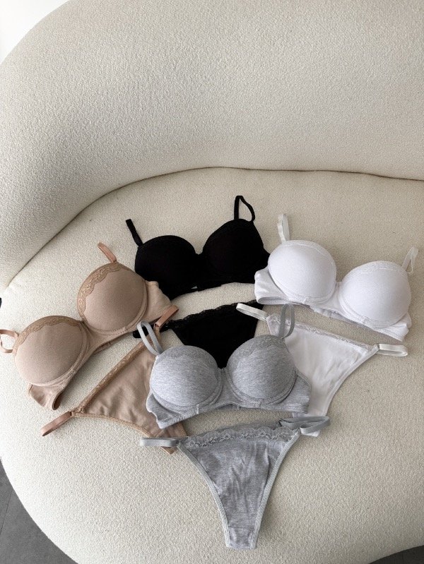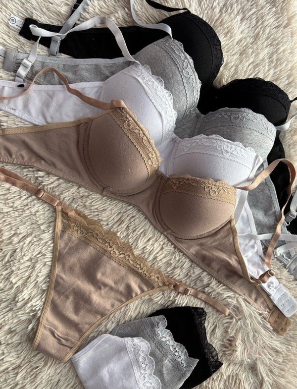 Conjunto de algodon con puntilla, taza soft push up con aro y less regulable. El corpiño viene por talle del 85 al 100.