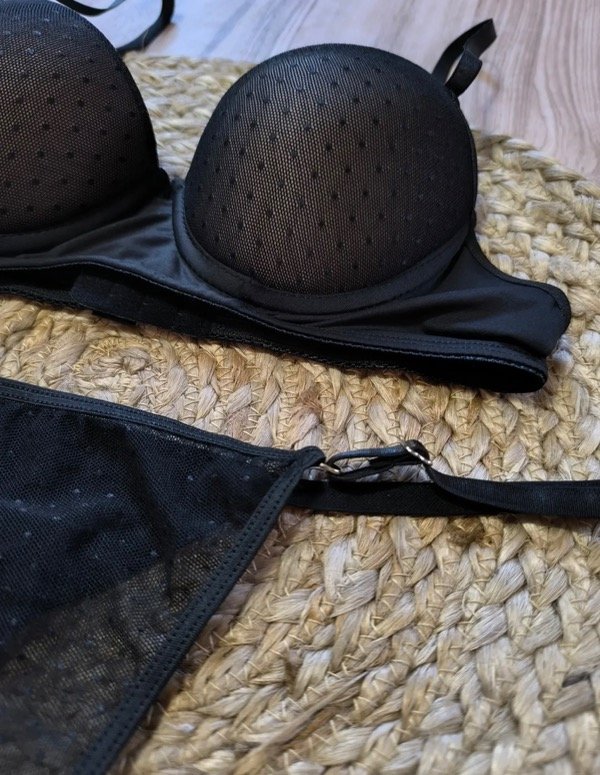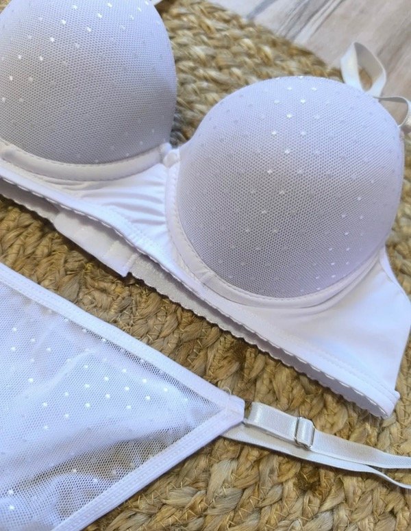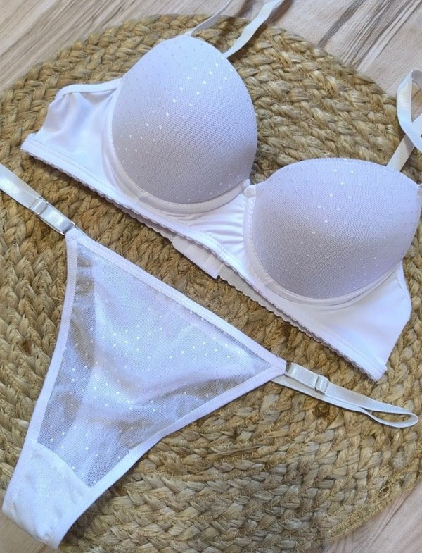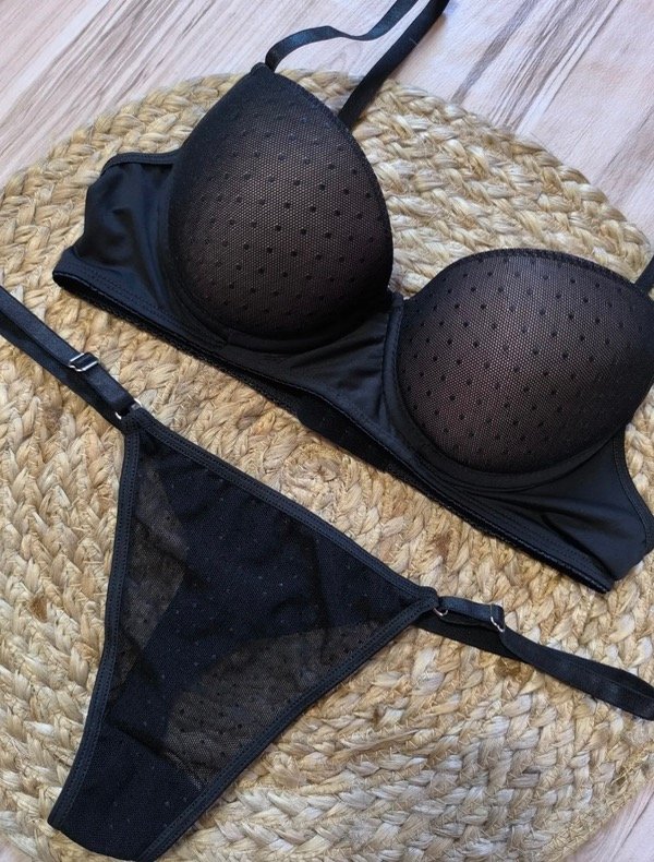 Conjunto de microtul con espalda de microfibra, taza soft push up con aro y less regulable. El corpiño viene por talle del 85 al 100, la less es regulable y talle único.