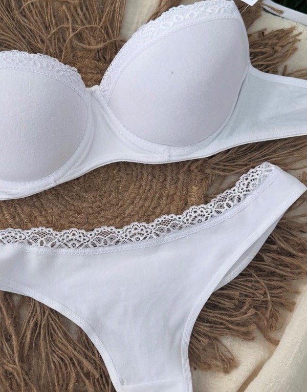 Conjunto taza soft con aro y push up de algodón con puntilla. El corpiño viene por talle del 85 al 100, la les es talle único.