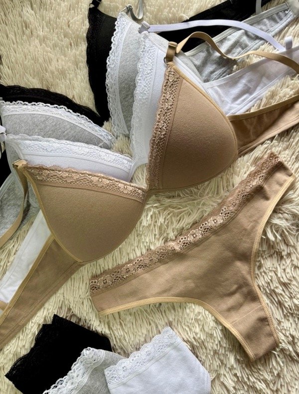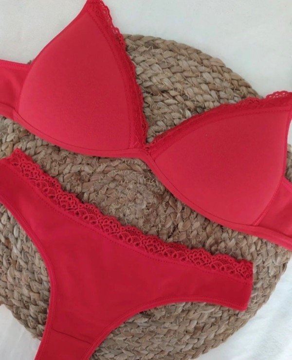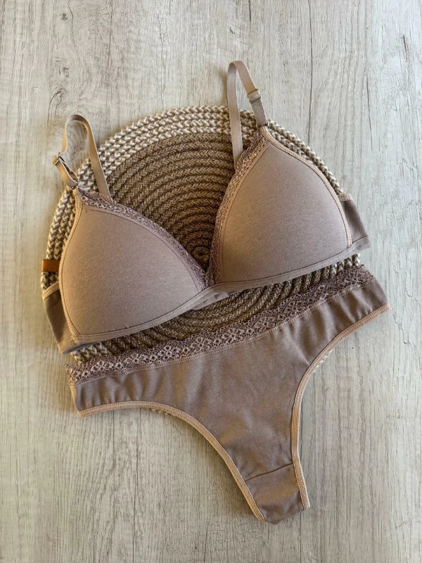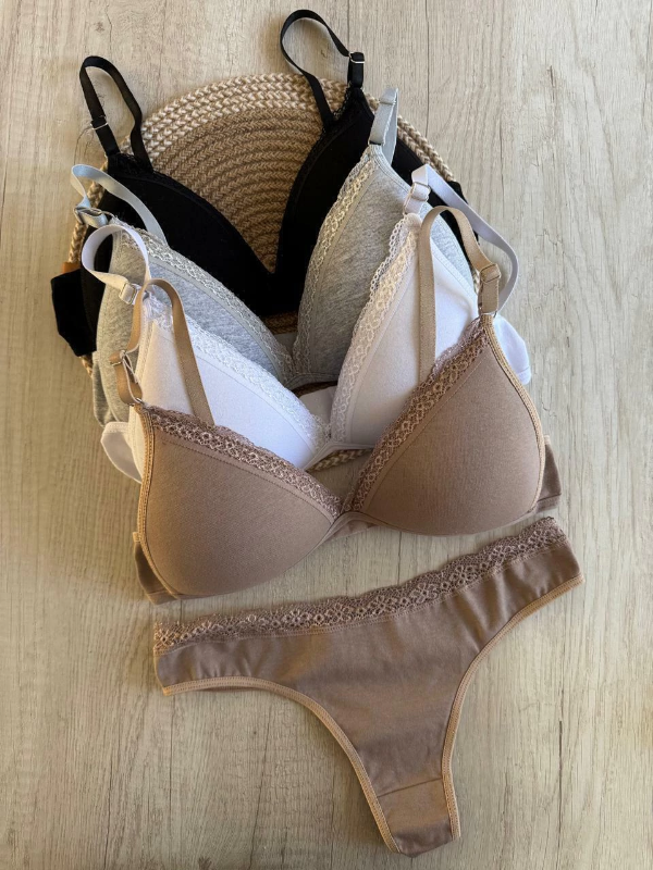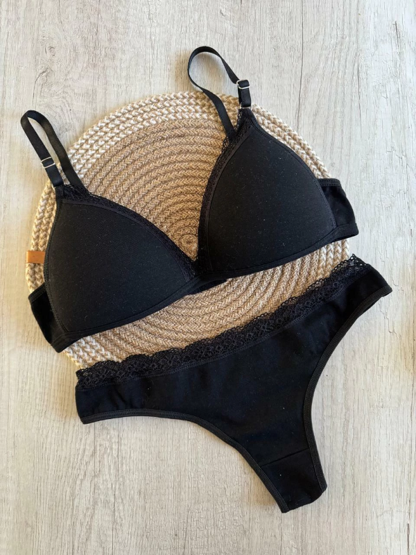 Conjunto taza soft triangulo de algodón y puntilla con less. El corpiño viene por talle del 85 al 100, la less es talle único.