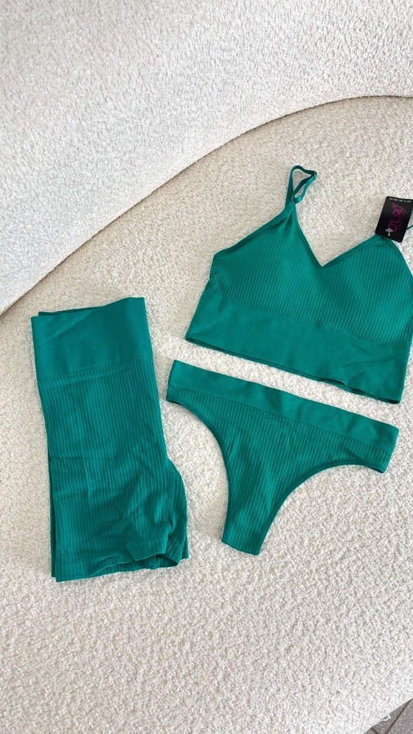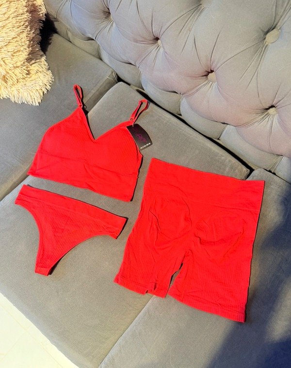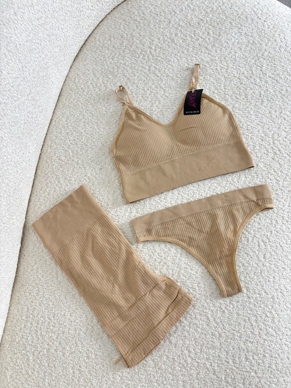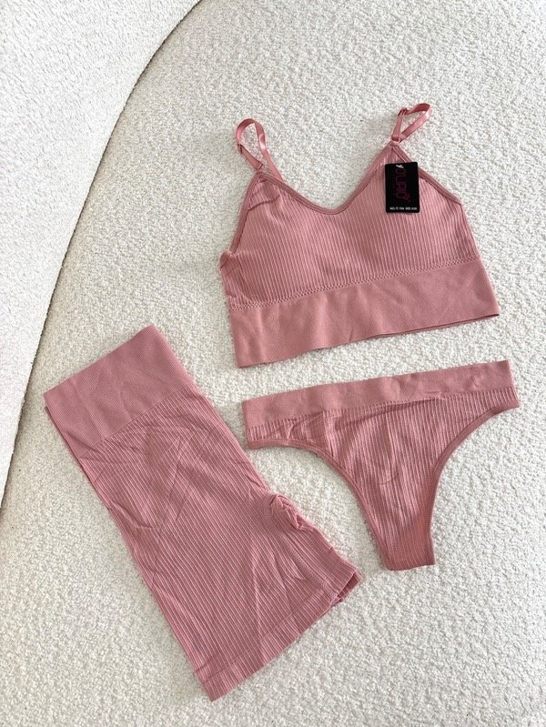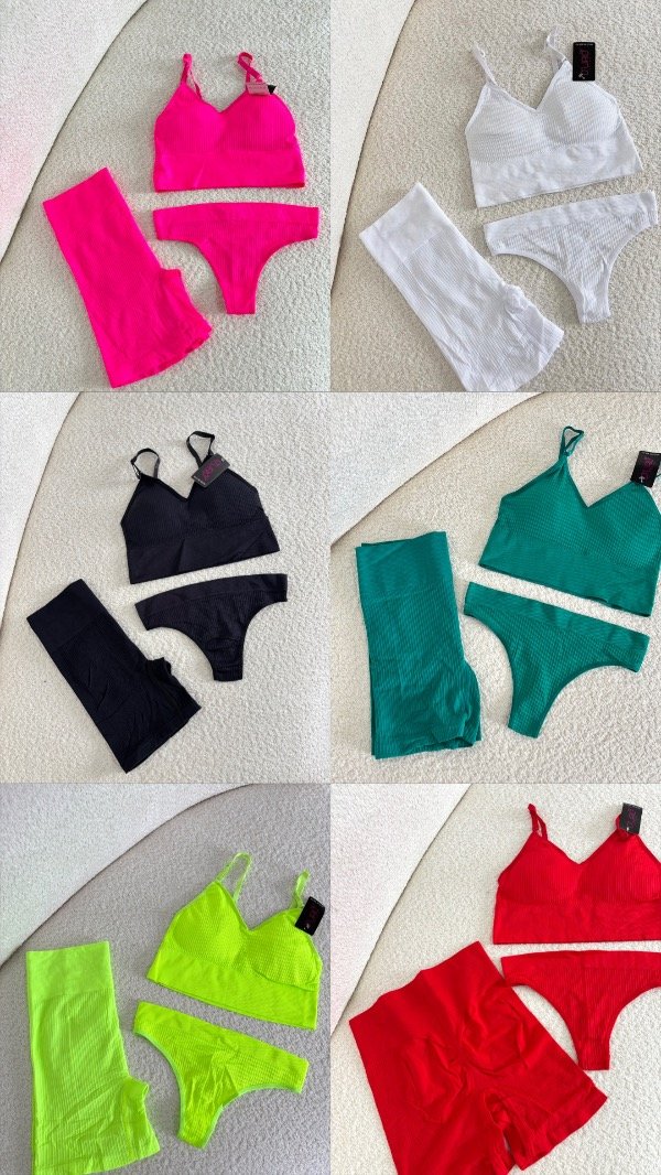 Set de 3 piezas texturado tipo morley: short push up + top con rellenito desmontable + less tiro alto. Viene en 2 talles, es de calidad PREMIUM y trae spandex por lo que ceden muchisimo.